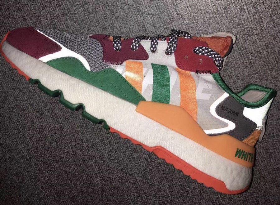这双鞋以 adidas Nite Jogger 为蓝本,以低饱和度的撞色构成。麂皮材质与网面拼接组合,颇有解构 设计风格。