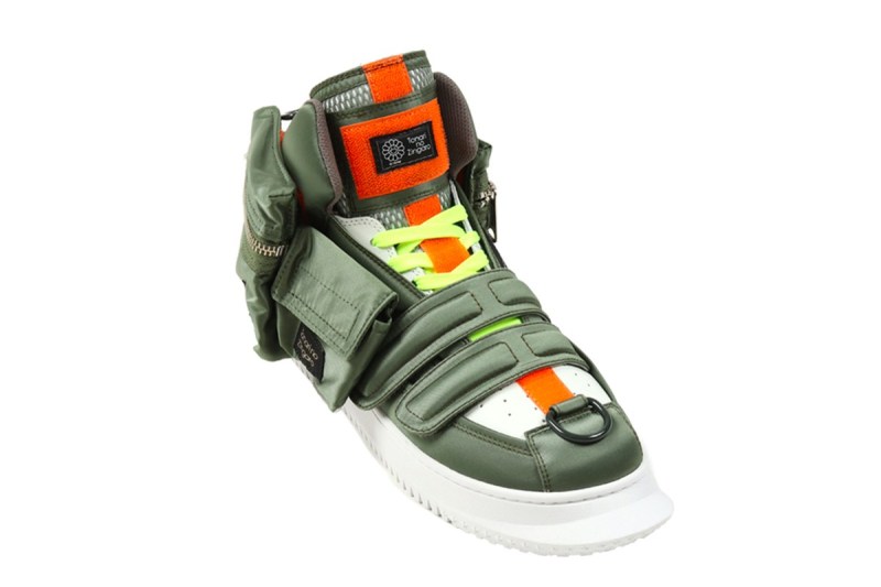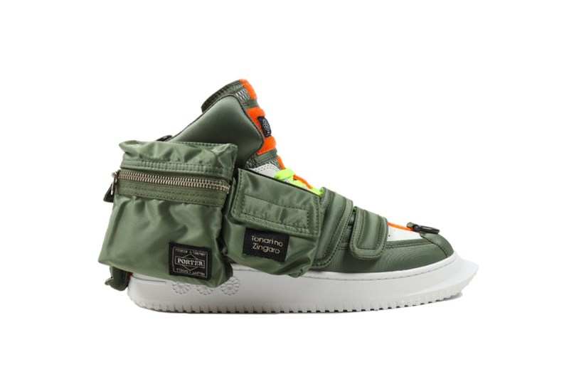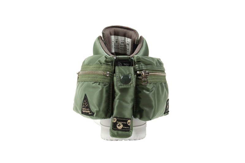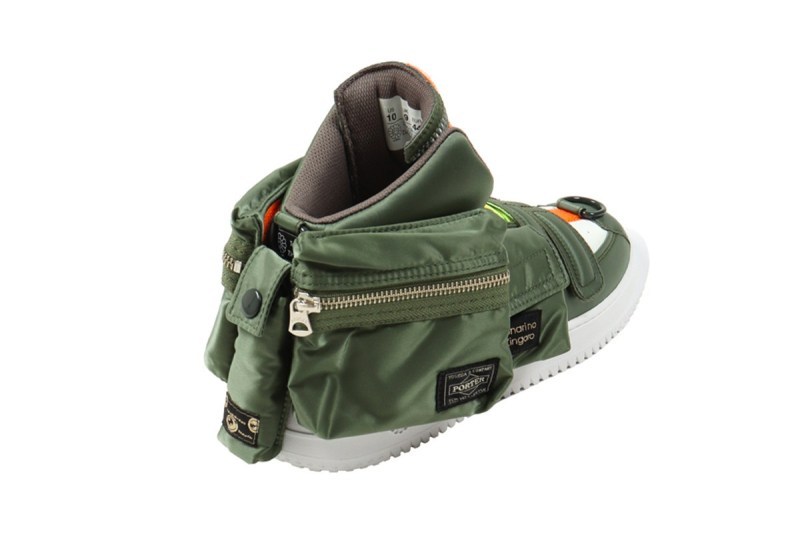 鞋身采用 PORTER TANKER 系列标志性的军绿与橙色调,并且加以军事感十足的口袋设计。