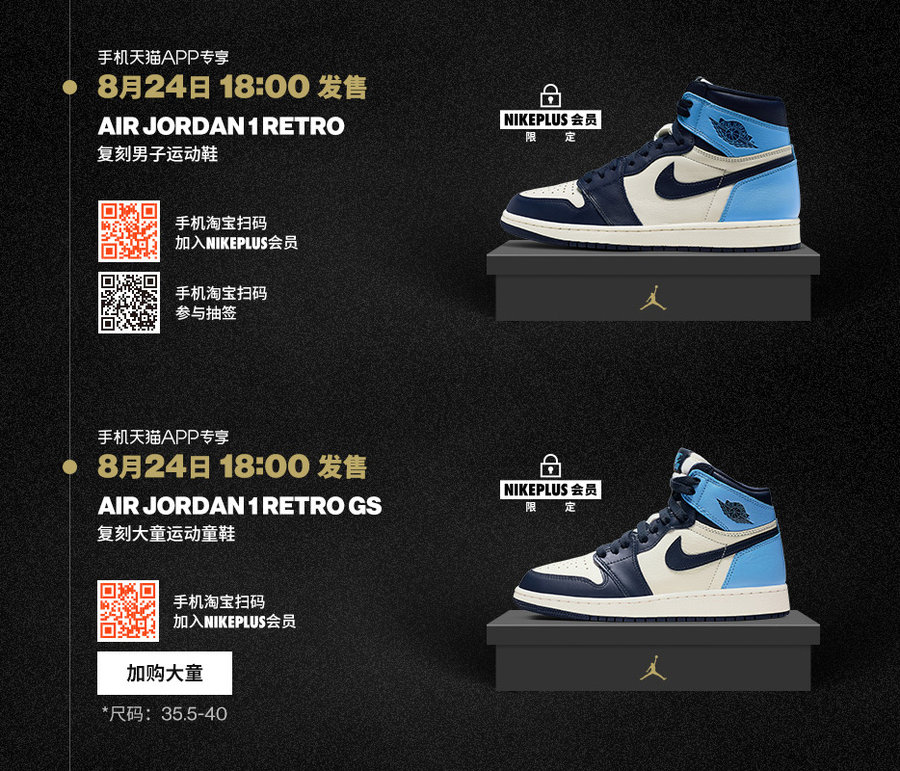 晚上 6 点将抢先发售黑曜石配色 Air Jordan 1 “Obsidian“,早于正式发售一周时间,但仅为 NikePlus 专属。