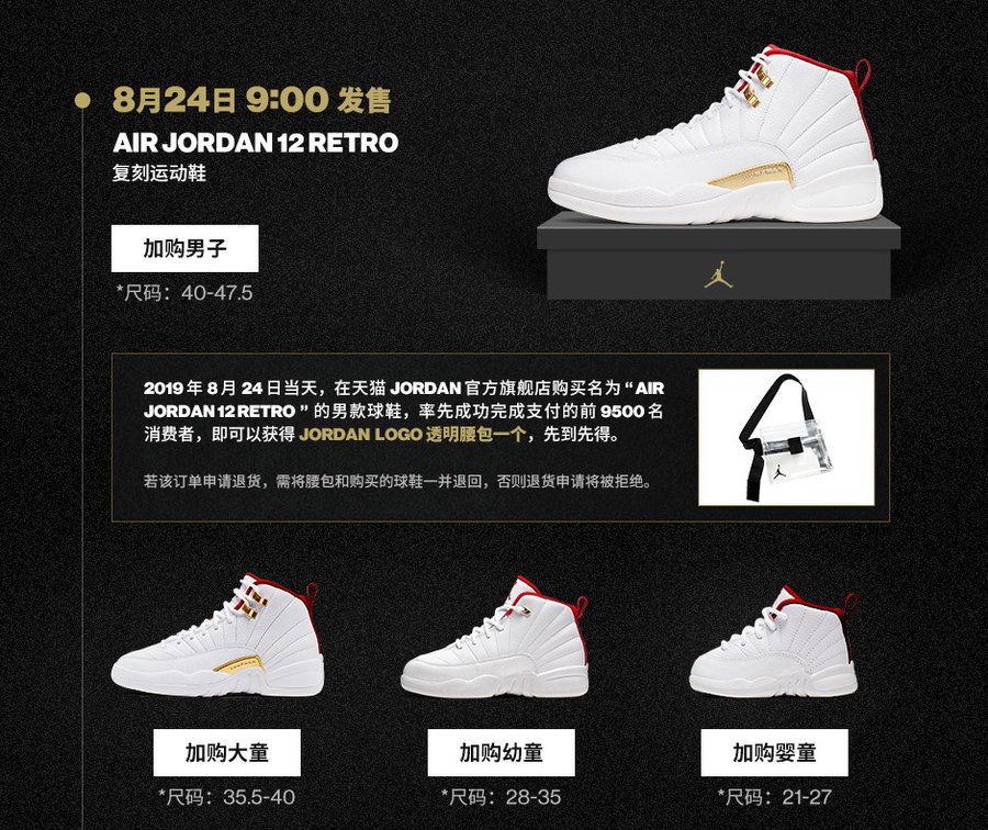 8 月 24 日早 9 点将发售 Air Jordan 12 “FIBA” 配色,全家族尺码,覆盖 21 码至 47.5 码。