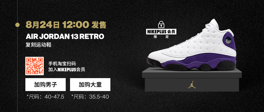 中午 12 点将发售 Air Jordan 13 “Lakers” 配色,男女码规格,覆盖 35.5 码至 47.5 码。
