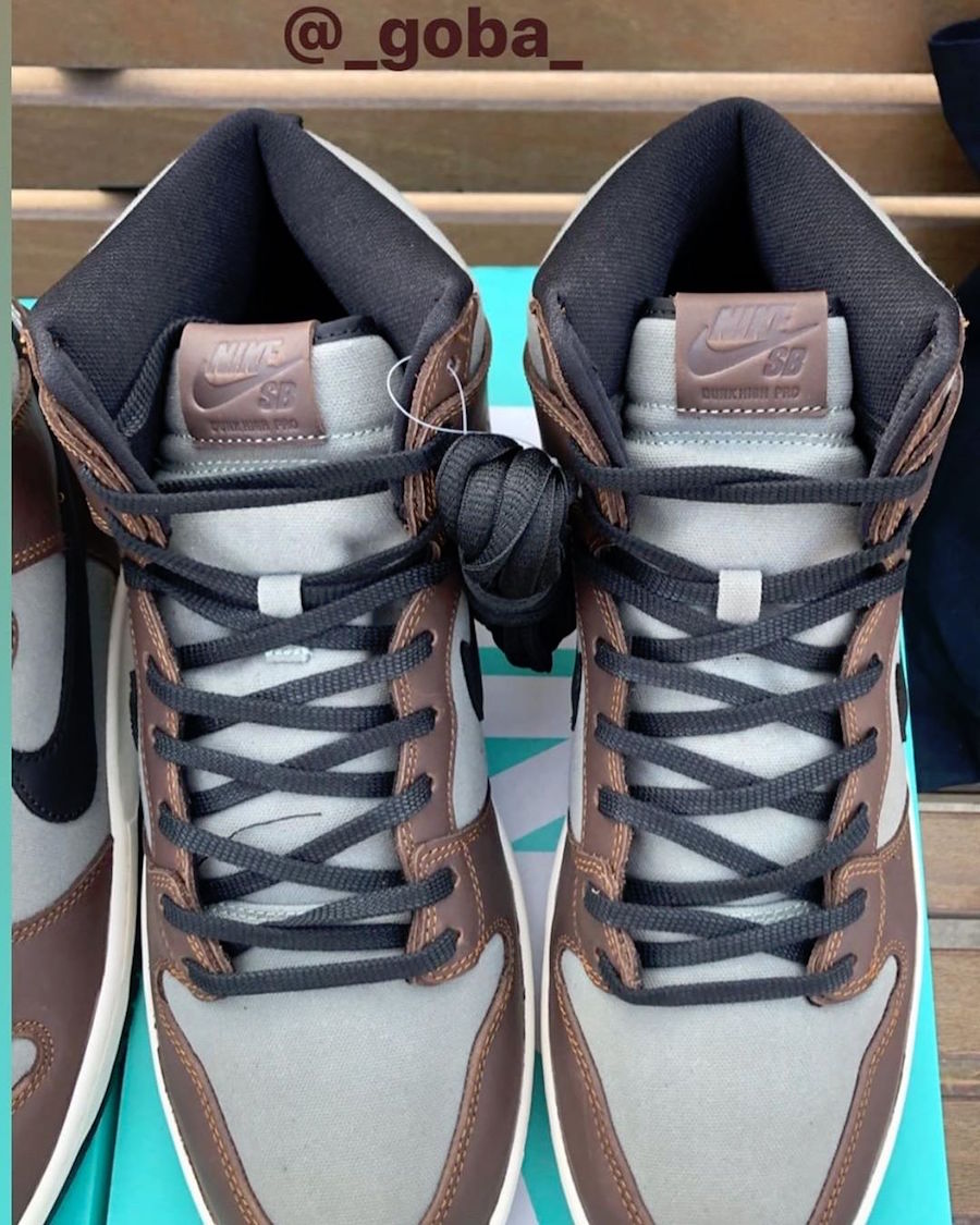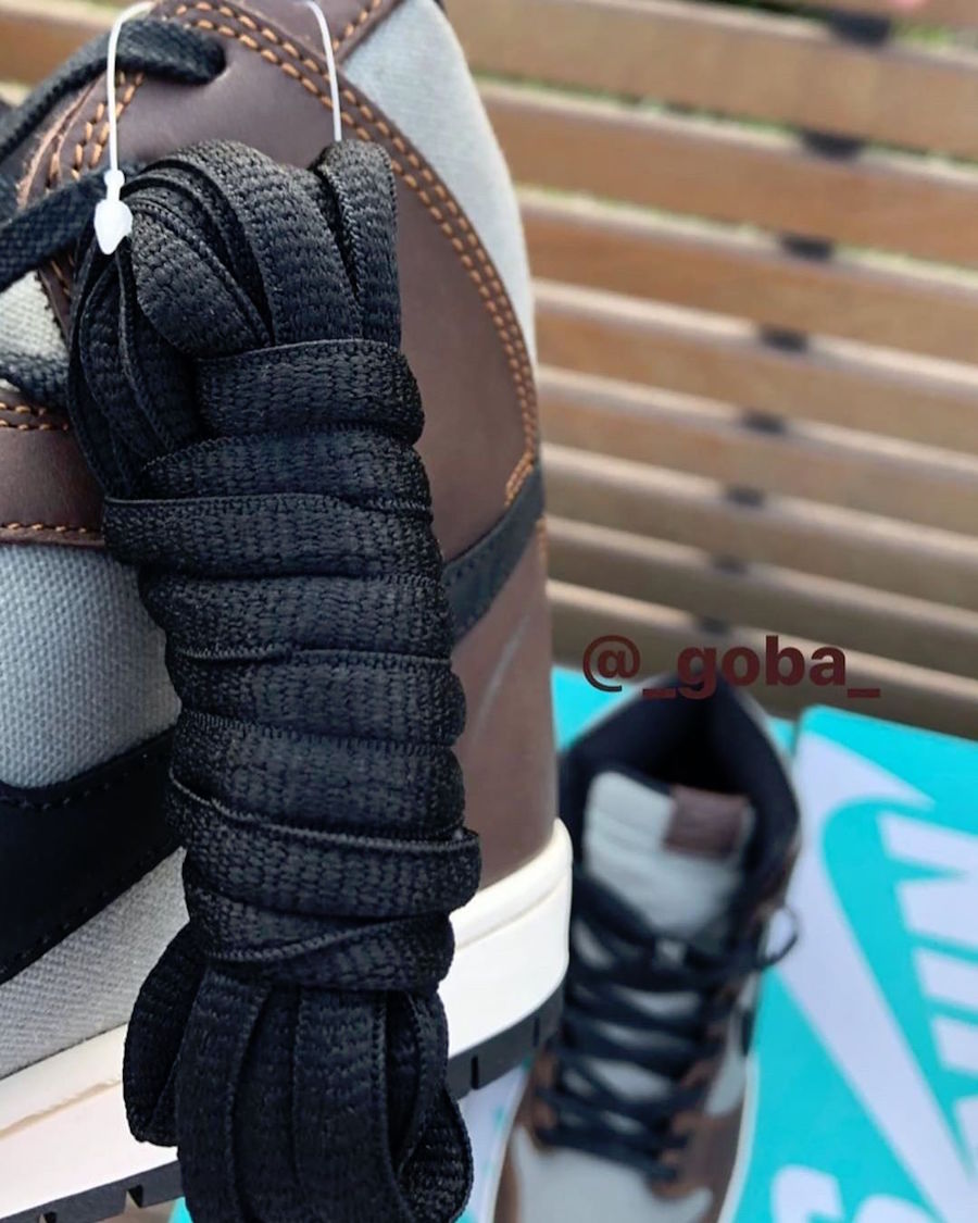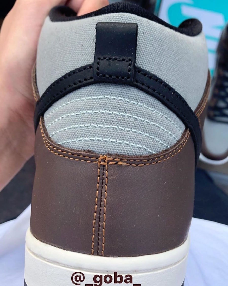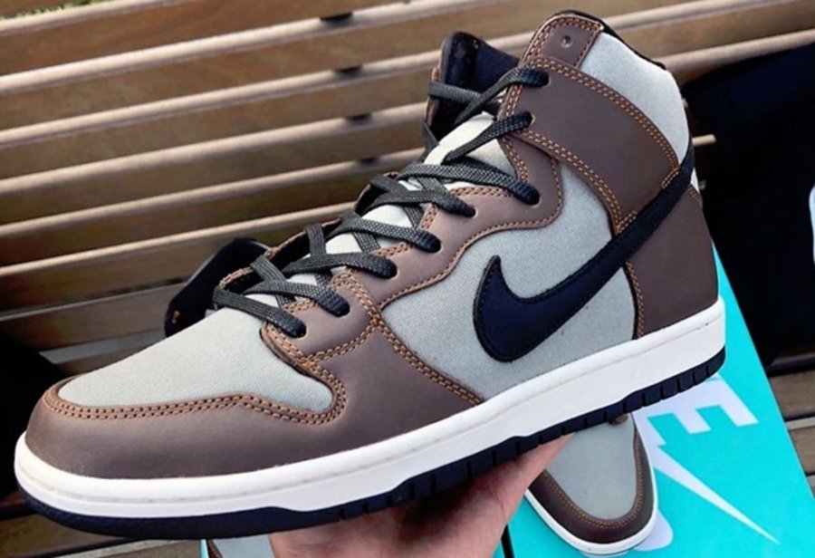 这双少见的高帮 Dunk SB 以巴洛克棕色皮革,搭配灰色尼龙材质,呈现出沉稳高级的鞋身质感。