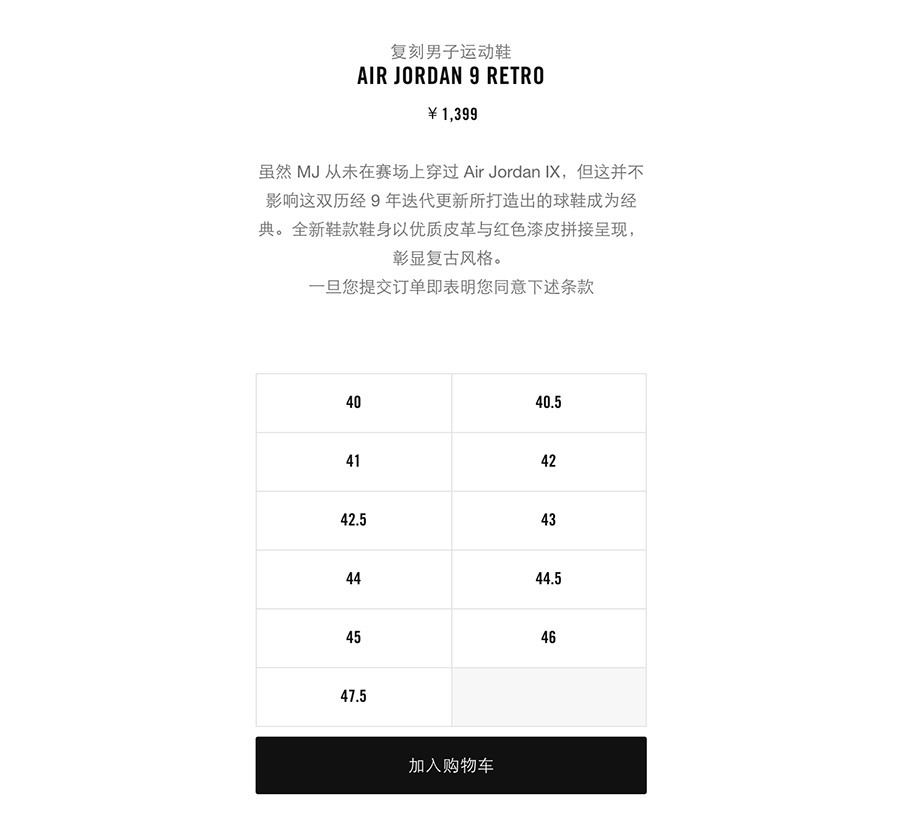 虽然 Air Jordan 9 的人气平平,但这款讨好配色还是有不错的关注度,目前官网码全。