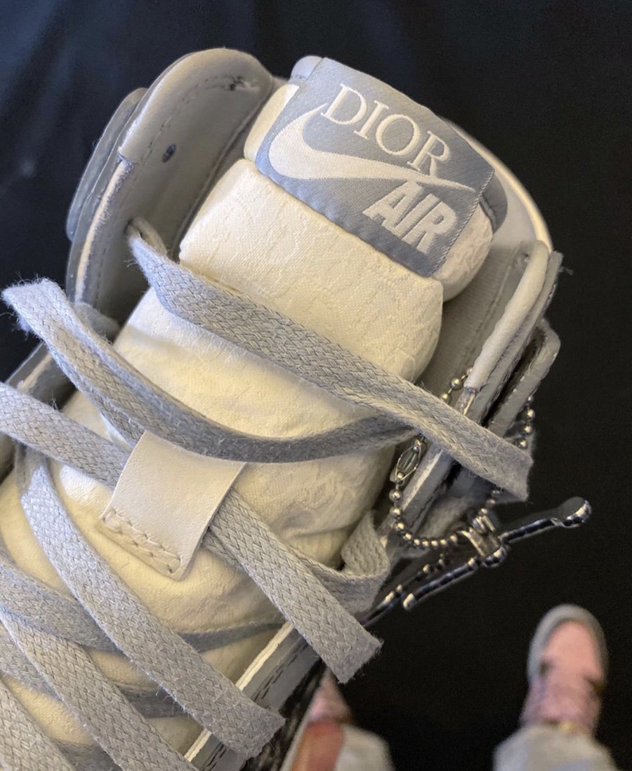 鞋面以乳白色和浅灰色为主调,侧面 Swoosh 以 Dior 经典的满印老花帆布打造,鞋帮上的经典飞翼改为 “AIR DIOR” 字样彰显联名身份。