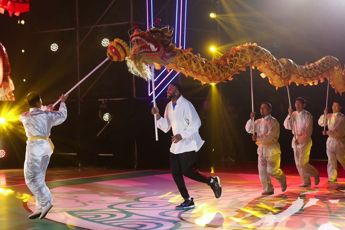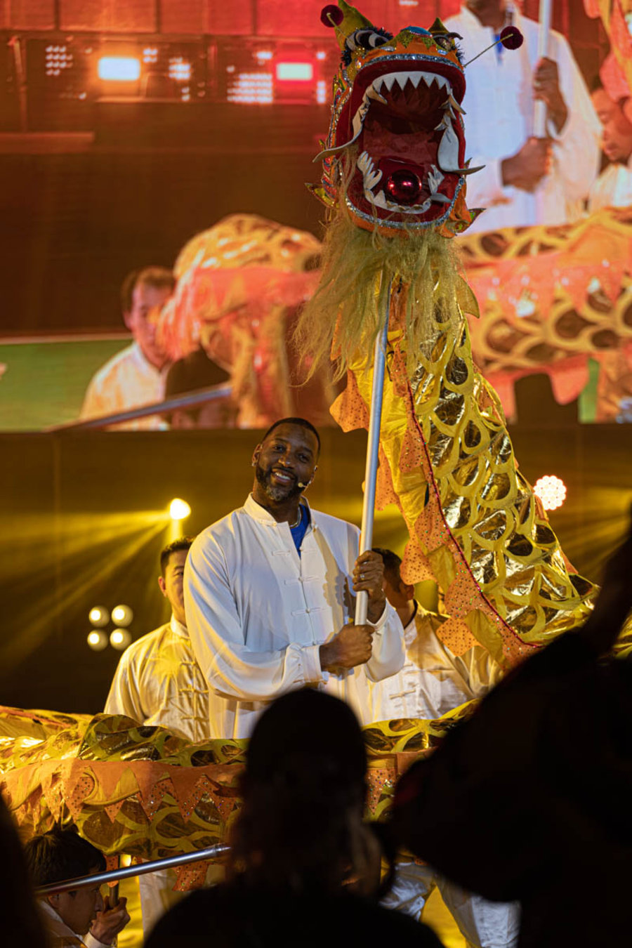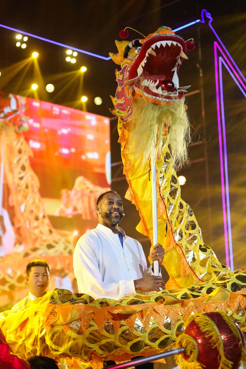 在活动的最后,麦迪换上唐装,提前玩起了节日舞龙。
