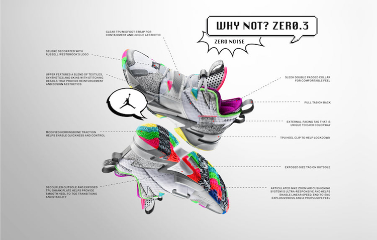 整双鞋在造型上延续威少一贯代表的速度与爆发,同时首发 Zer0 Noise 配色采用多种色彩覆盖鞋面,也展现出长久以来威少的独特审美,其设计灵感源自威少无惧场上干扰,专注比赛的态度。