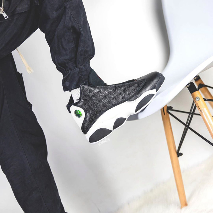整双鞋将原本熊猫 Air Jordan 13 鞋身黑白双色对调,黑色鞋身主体搭配白色中底与黑色豹掌,构成「反转熊猫」效果。鞋舌红色 Jumpman Logo 点缀,鞋带前端位置相同配色 Jordan 标签点缀,整体配色风格十分犀利。