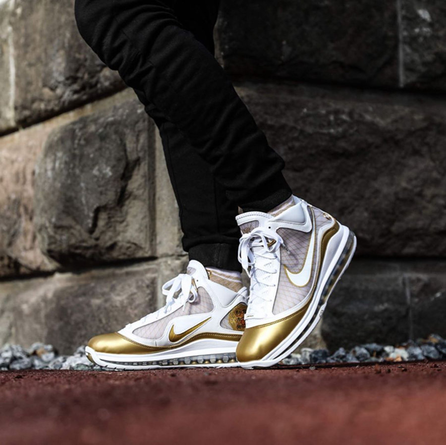 贯穿足底的 Air Max 气垫搭配 Flywire 轻质鞋面+内靴组成,提供相对轻质又强大的缓震性能。鞋身一袭白金配色加之「勒布朗詹姆斯」、「七」以及「小皇帝」等汉字元素,带来满满中国风韵味。