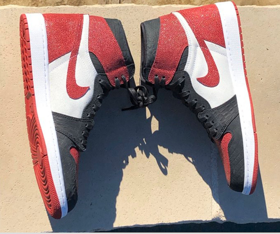 最大亮点当属鞋身红色部分设计,并非采用简单的纯色设计,而是采用魔鬼鱼花纹设计,同时黑色部分也融入动物皮革纹路,为整双鞋渲染狂野的气质。