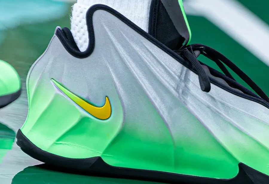 鞋身框架以石斑纹装饰,橙色鞋头、侧身鞋面搭配,橙色、绿色 Swoosh Logo 装饰在一内一外。