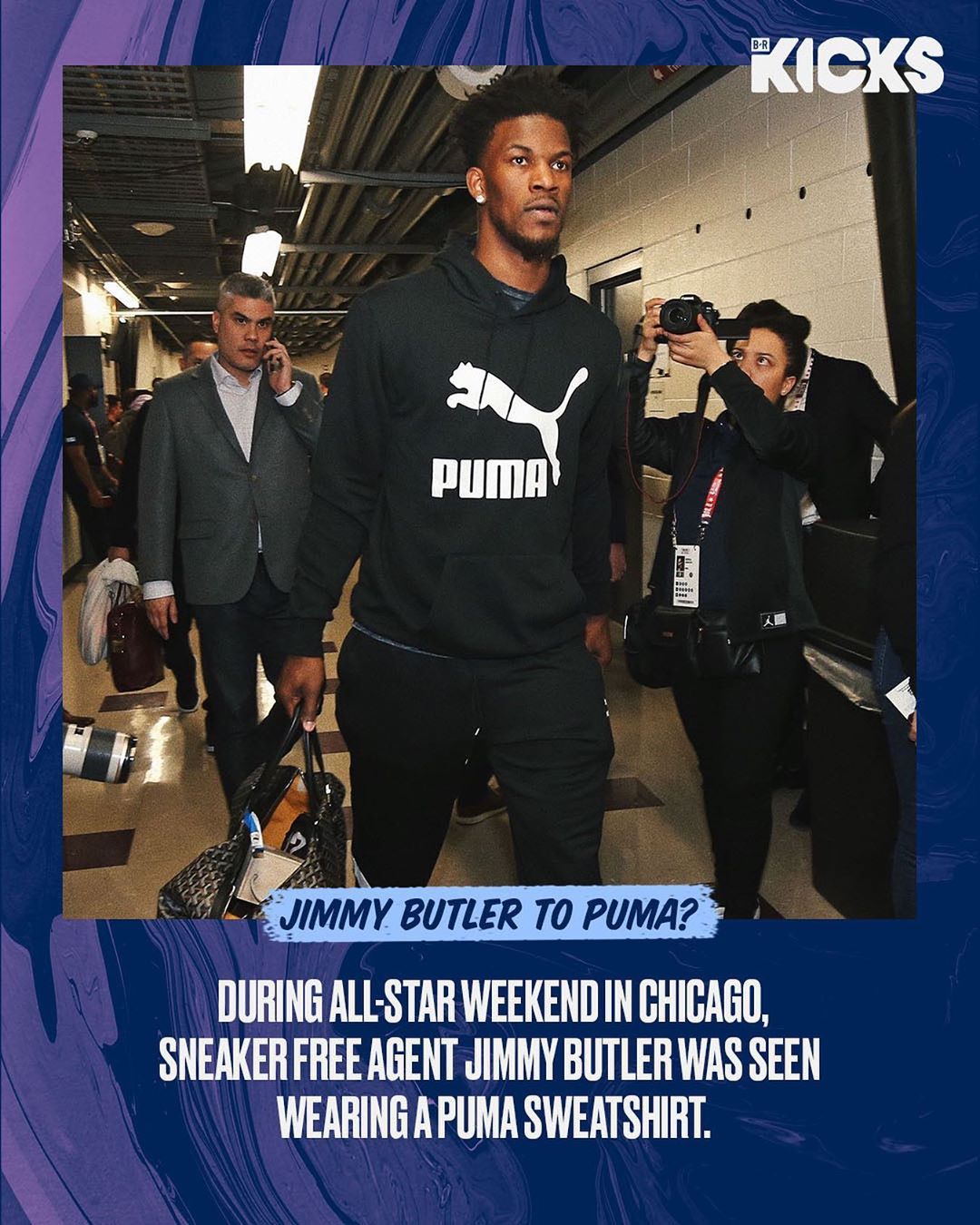 近日,海外知名球鞋曝料账号 @Brkicks 在 Instagram 上晒出了一张吉米·巴特勒(Jimmy Butter)的球员通道照,他身着一件黑色 PUMA 套头帽衫。