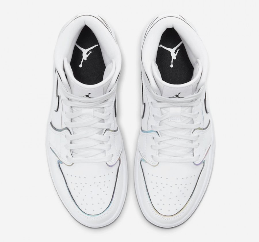 另一款则是二次元风格的 Air Jordan 1 Mid,近两年火爆的纯白 + 黑色勾线,这次终于有了官方版本,还暗藏反光效果。