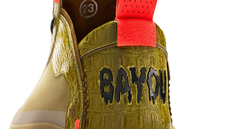 以亚利桑那州河口的鳄鱼为灵感,以棕色为主色调,皮革部分采用了带有金属光泽的鳄鱼纹皮革。鞋头标签印有尖牙图案,后跟则是 BAYOU 字样,呼应 Bayou Boys 配色主题。