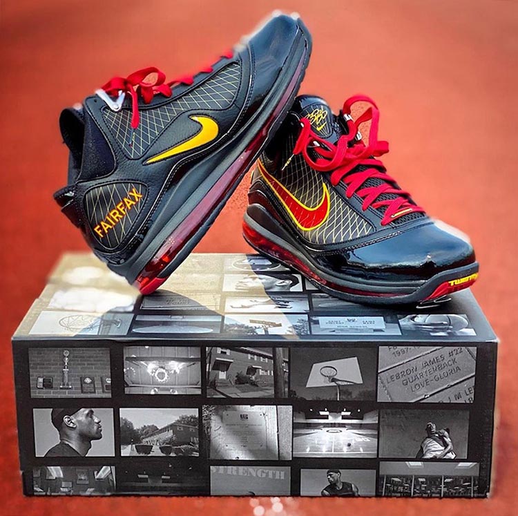 以詹皇资助的 Fairfax 高中为灵感,将这款当年的 PE 版本复刻带来。整双鞋以黑红配色为主,细节处辅以黄色点缀,鞋身内侧后跟位置的 Fairfax 字样,揭露整双鞋的独特身份。