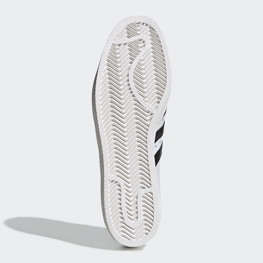 一双再现了 Superstar 贝壳头经典的黑白配色,清爽的白色皮革鞋身,辅以干练的侧边三条杠,再以黑底白标的三叶草 Logo 收尾。