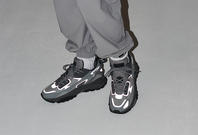 细节方面,AAPE VOYAGE 于鞋筒口内里 270 度的两侧及后方位置采用加厚泡棉填充的手法加强入脚后的整体感;鞋垫采用回弹力舒适的发泡材料,底面设计配有脚型呼应的弯折凹线,增强穿着体验;后跟采用独特框架结构的 TPU 材料,令行走时后跟保持稳定舒适性,同时增加复古感十足的宽皮料拉带,令穿着提拉时更便利;鞋舌采用厚填充料手法,形成整体厚胀的鞋舌形态,复古及更贴合,鞋舌外侧中间部位采用鞋带穿孔防偏移部件,于细节设计中防止穿着时鞋舌偏移;圆形鞋带粗细适中、采用棉质材料,鞋带眼扣部位两侧采用皮料片,整体协调了不同材料之间捆绑的稳定性,并减缓了上脚系紧后对脚面的压迫感。