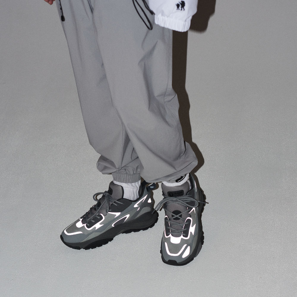 AAPE VOYAGE 鞋面主体大面积采用高级皮革物料配以绒面; 鞋身采用多层次波浪线条及物料叠加,于不同位置覆盖不同线条造型的幻彩反光材料,在灯光的照射下提升个性; 鞋身筒口内里采用透气舒适物料,并设计有后跟分层内舌部件。