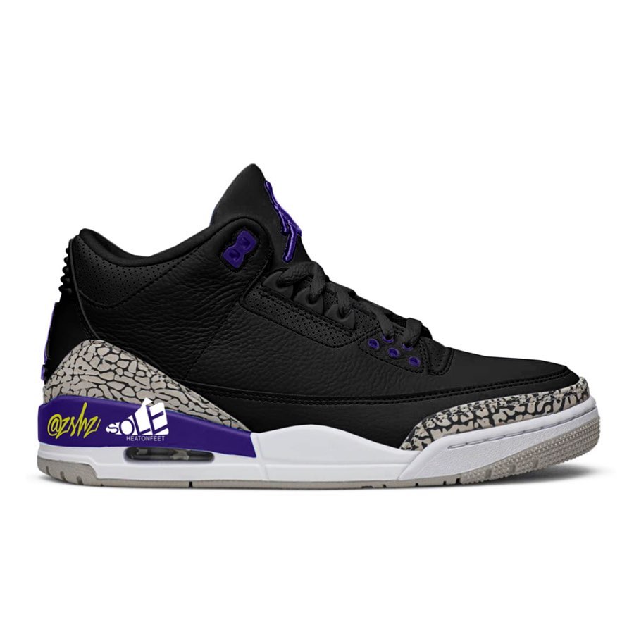 最后还有一款黑色的 Air Jordan 3,在承袭爆裂纹细节的同时,又有亮眼的紫色点缀,颇有湖人队的气息。
