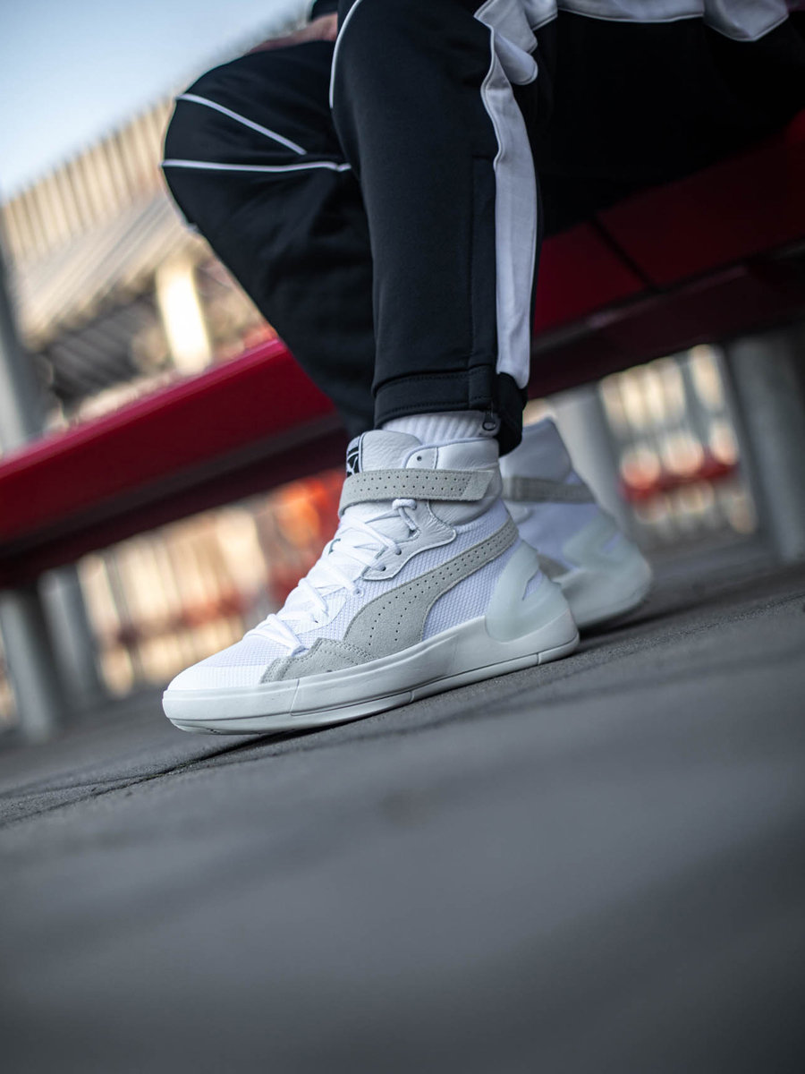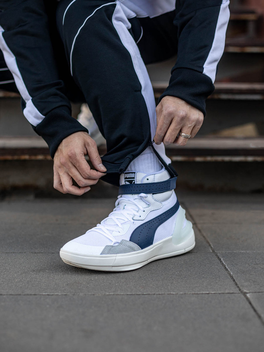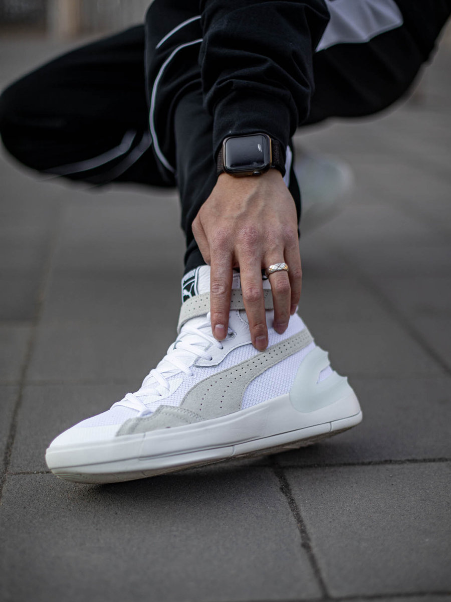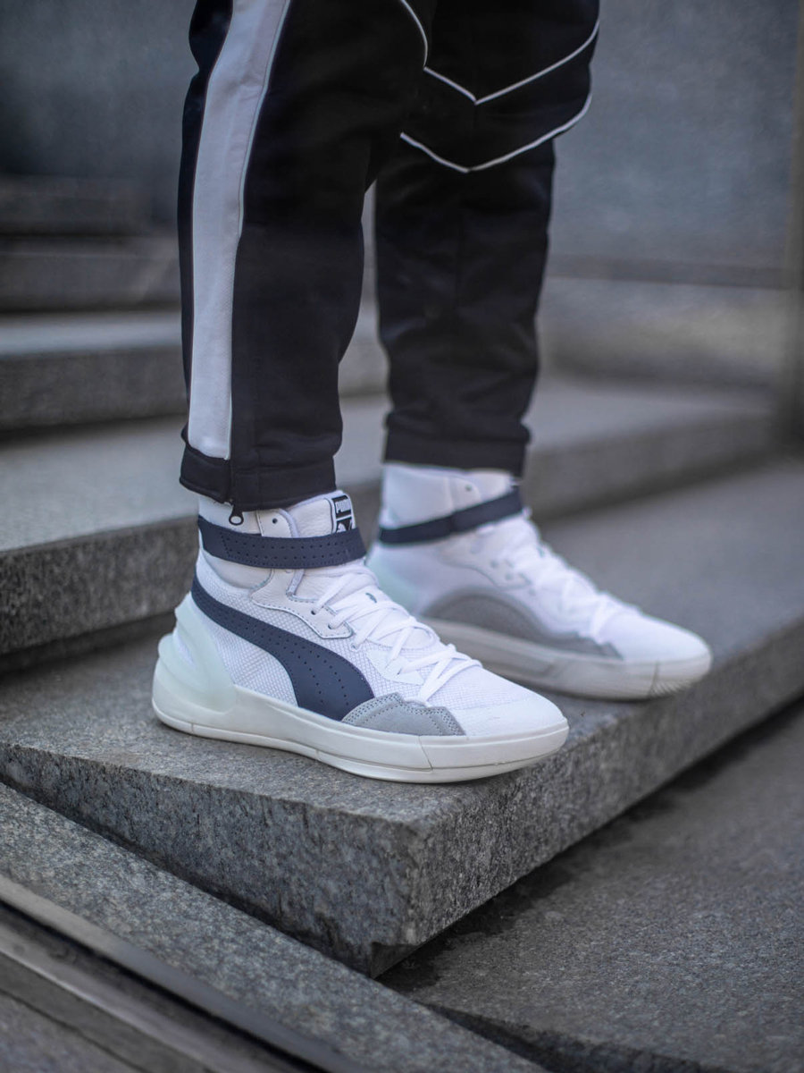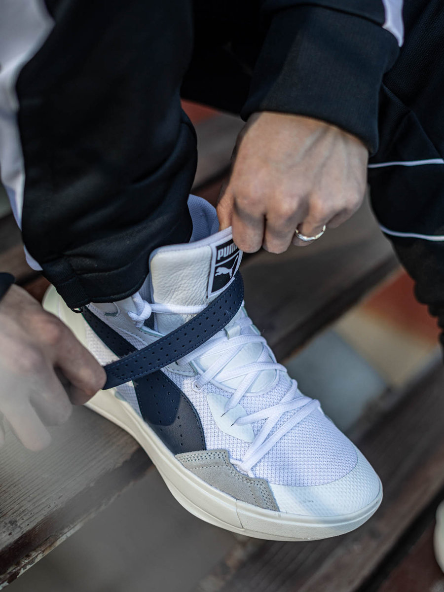融合实战鞋与潮流质感的设计语言,呈现在复古韵味十足的 PUMA Sky Modern 上,可谓是颠覆常规篮球鞋的前卫代表。