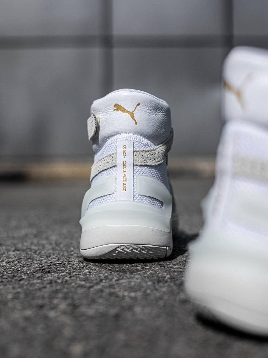 后跟以烫金样式的 PUMA Logo 与 Sky Dreamer 点缀,Dreamer 的名称正是源自 J.Cole 厂牌 Dreamville,寓意着 「不被困难和时间击倒的追梦人」。