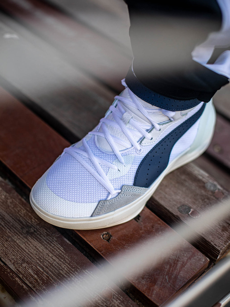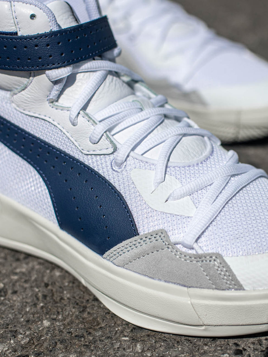 整双鞋以白色为基底,侧色标志性 PUMA Logo 以海军蓝呈现,鞋帮相同色调魔术提呼应,整体配色风格简洁高级。