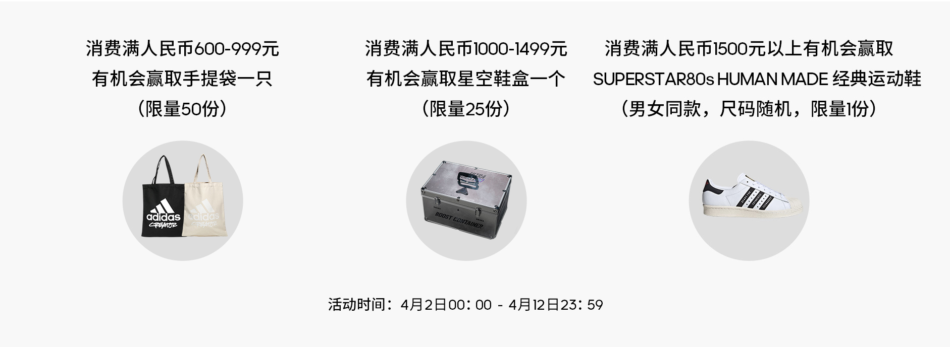 福利 1:adiCLUB 会员购物满额即可参加抽奖,有机会获得手提袋、限量鞋盒及 HUMAN MADE 联名贝壳头鞋款!