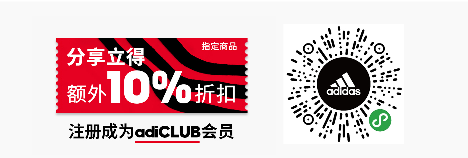 福利 2:扫码进入 adidas 官方小程序,邀请亲友加入 adiCLUB 会员,即可获得额外 10% 折扣。