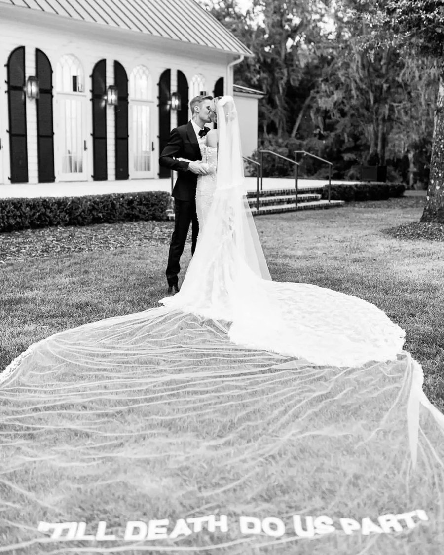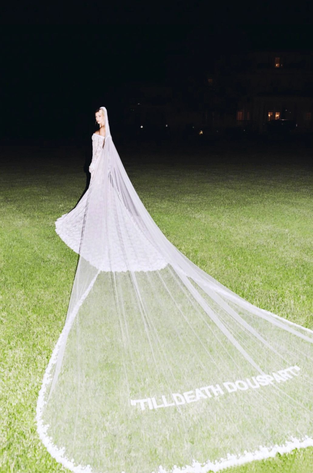 最值的一提的是 Hailey 身上这件是婚纱,由 OFF-WHITE 主理人 Virgil Abloh 亲自操刀设计,全手工打造,耗时一个多月之久。