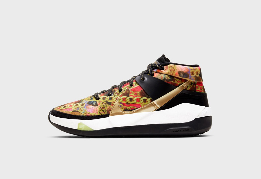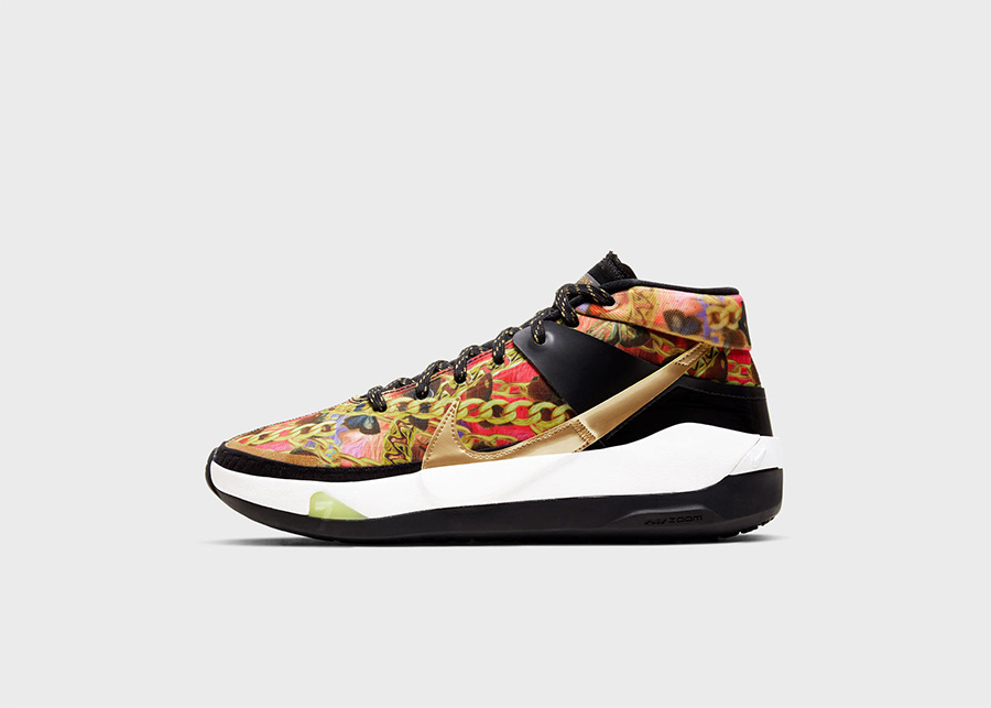 KD13 “Hype” 将在 4 月 18 日发售,致敬 Hip-Hop 文化,浮夸的金链图案带来高调气质的宣扬,有着独特的奢华感受。