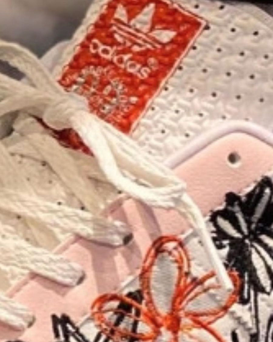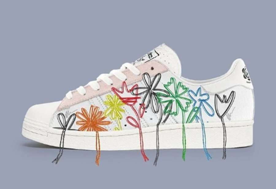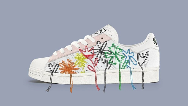 侧身除了标志性三线 Logo 以外,还有不同颜色的线条组成的花草图案,设计感十足。