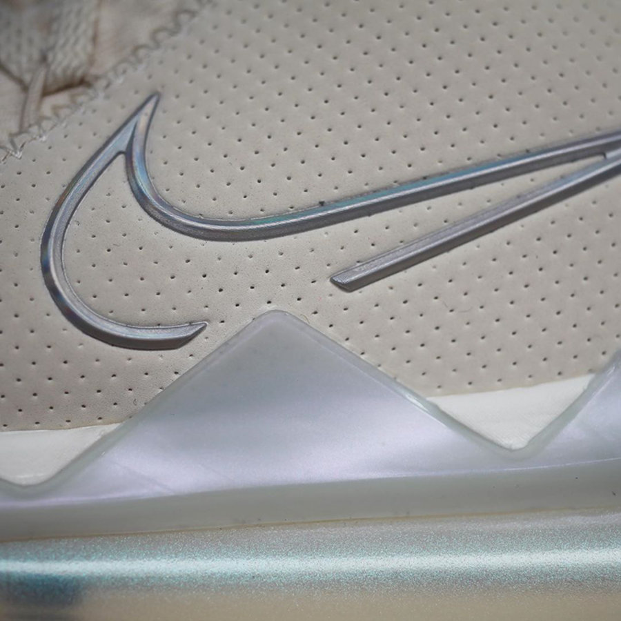 侧身搭配银色镂空 Swoosh Logo,进一步彰显整双鞋的浅色调主题。同时中底采用同淡蓝色水晶底材质包裹,外底部分还可看到小部分露出彩虹色调。