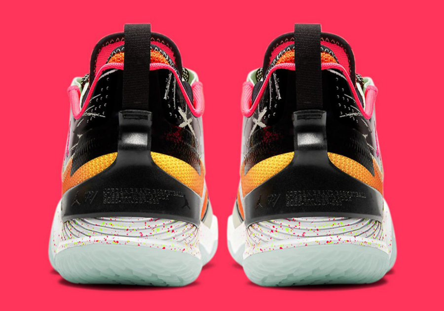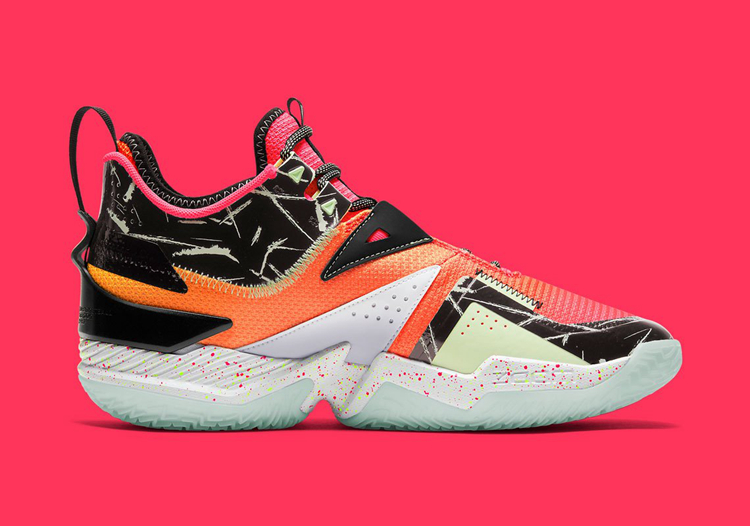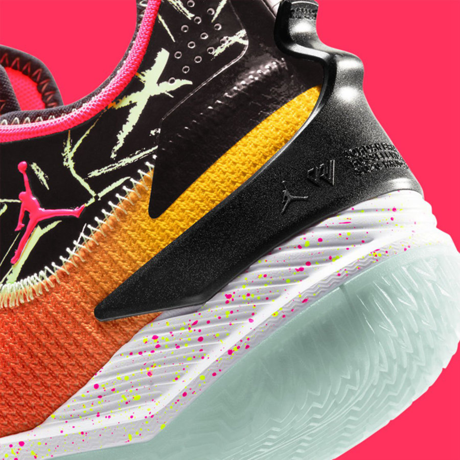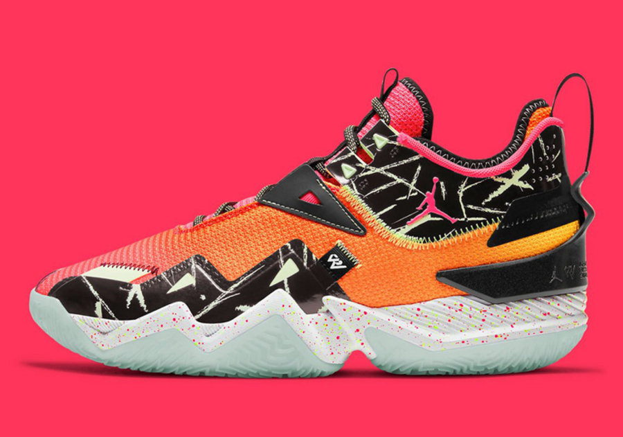 白色涂鸦与补强部分丰富整双鞋的细节设计,侧身可以看到威少个人 Logo 以及 Jumpman Logo。