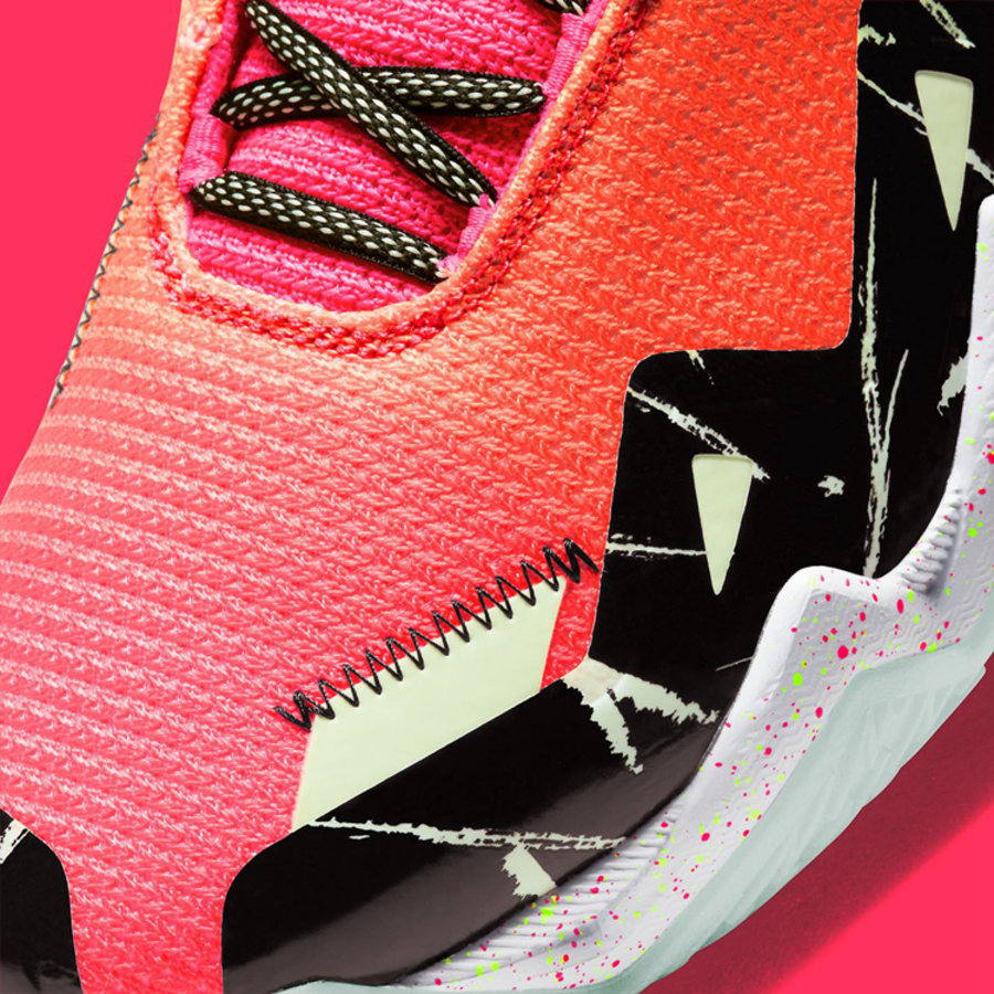 造型上与 Why Not Zer0.3 相似,延续凶猛的造型设计,材质上采用大面积网眼以及皮革材质。