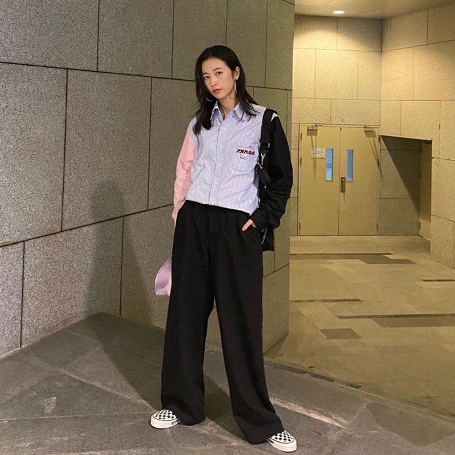 经典棋盘格与黑色阔腿长裤无缝衔接,