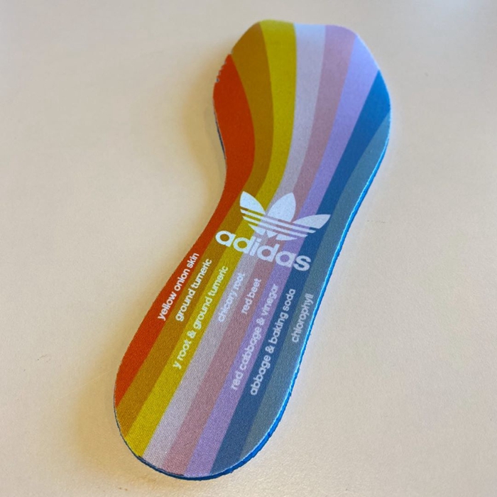 鞋款采用经典贝壳头为主题,通过多彩车线勾勒鞋身花卉细节,鞋垫则辅以彩虹色调诠释。