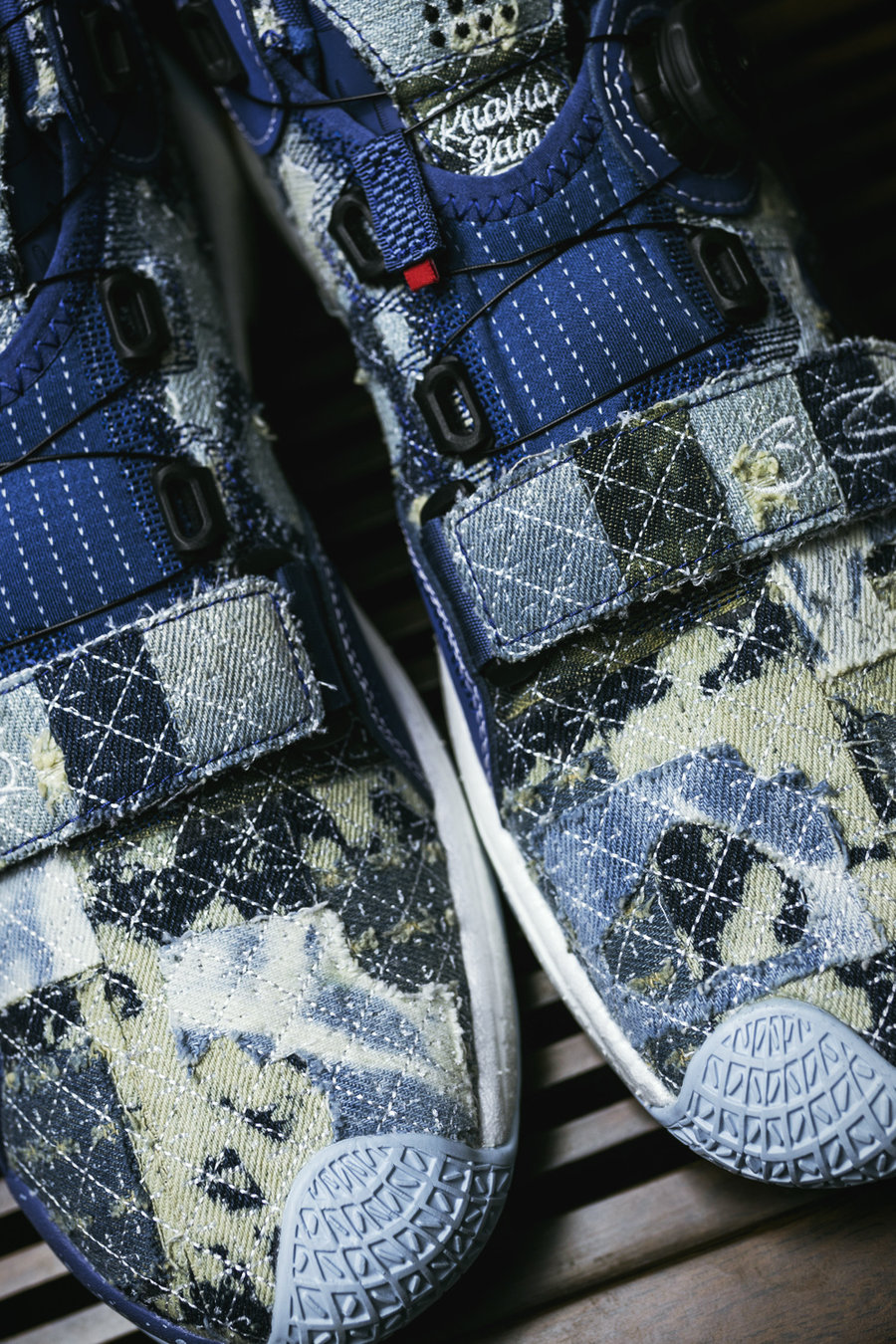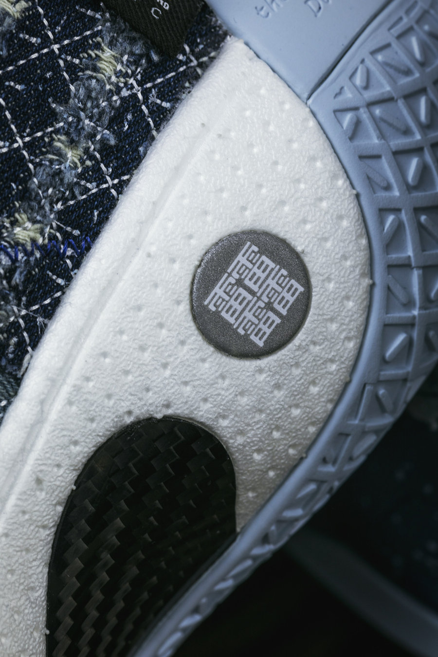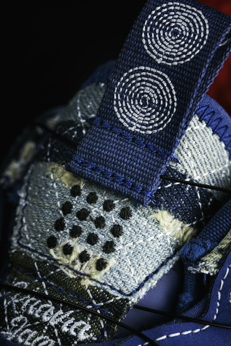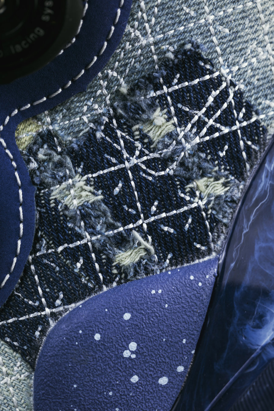 整体以蓝色为主色调,鞋面采用 8 种蓝染单宁材质拼接打造。