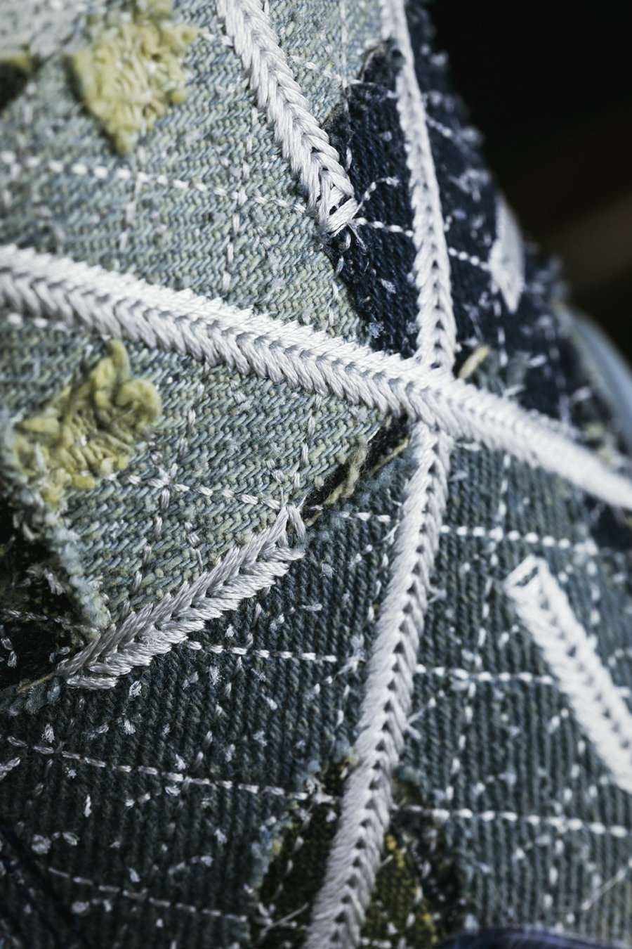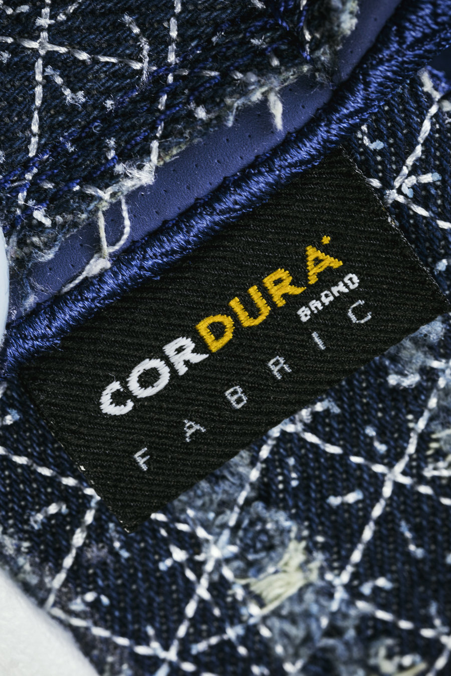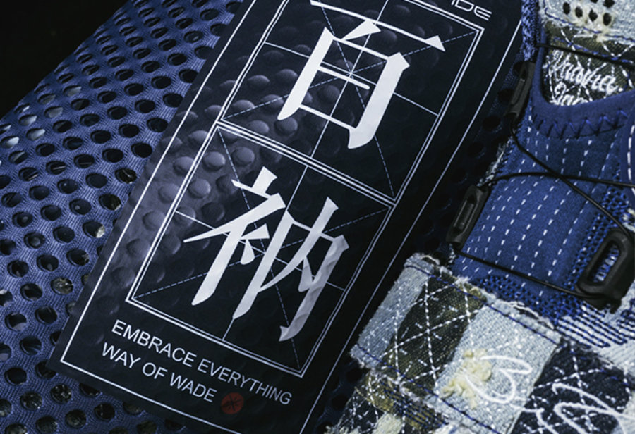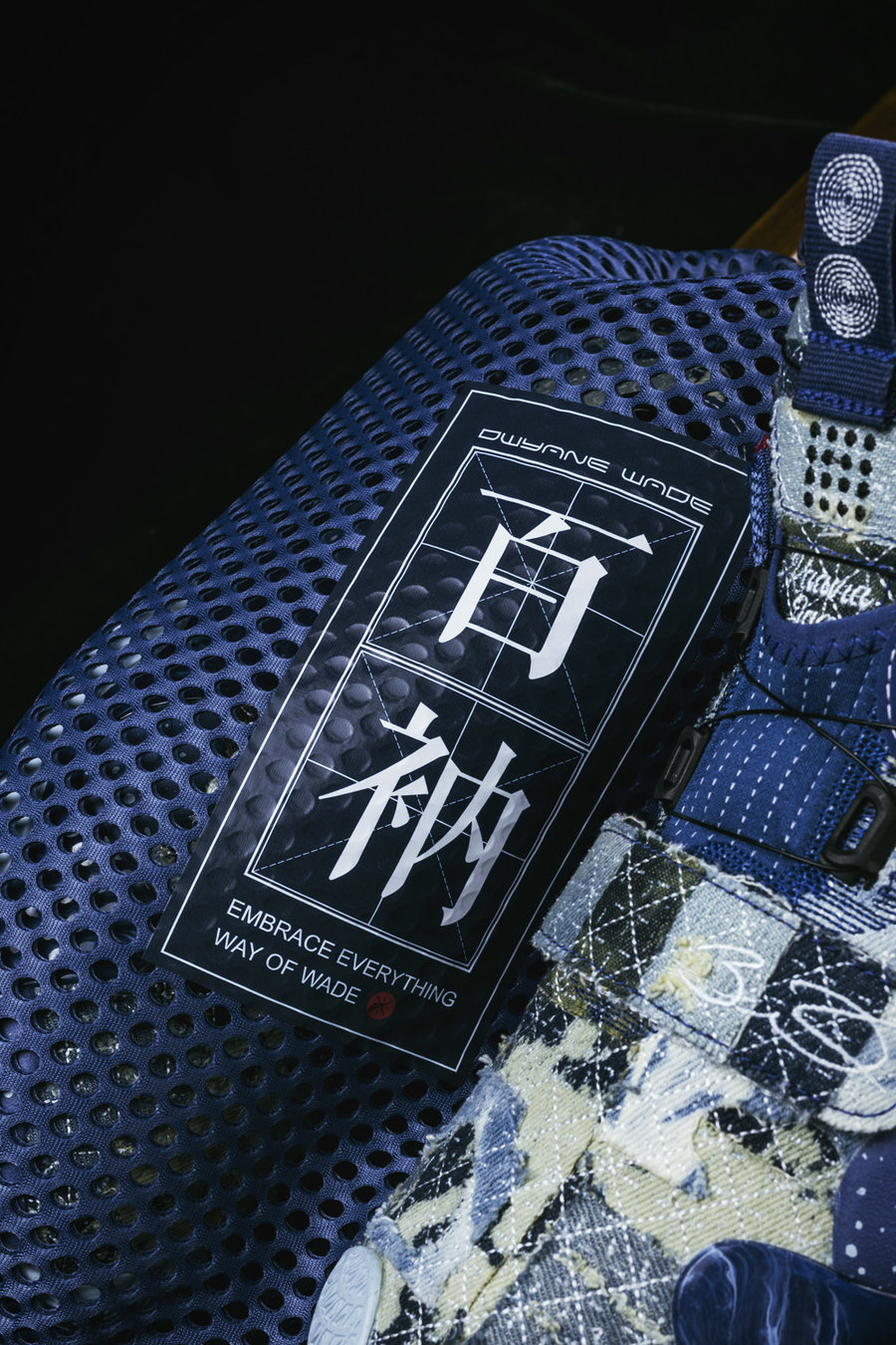 整体以蓝色为主色调,鞋面采用 8 种蓝染单宁材质拼接打造。