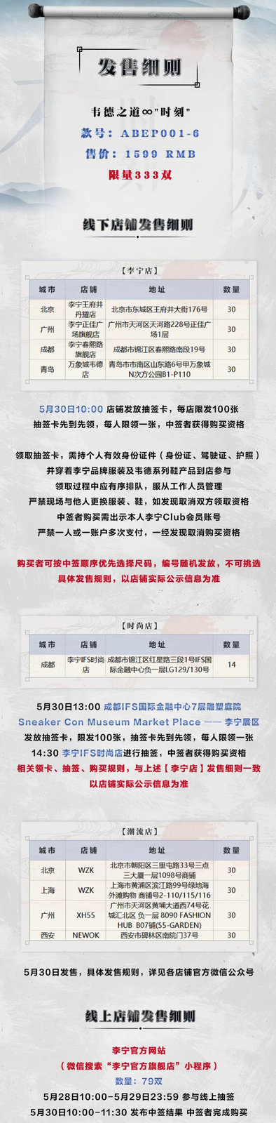 将在北京、上海、广州、成都、青岛、西安的李宁店和潮流店铺发售。