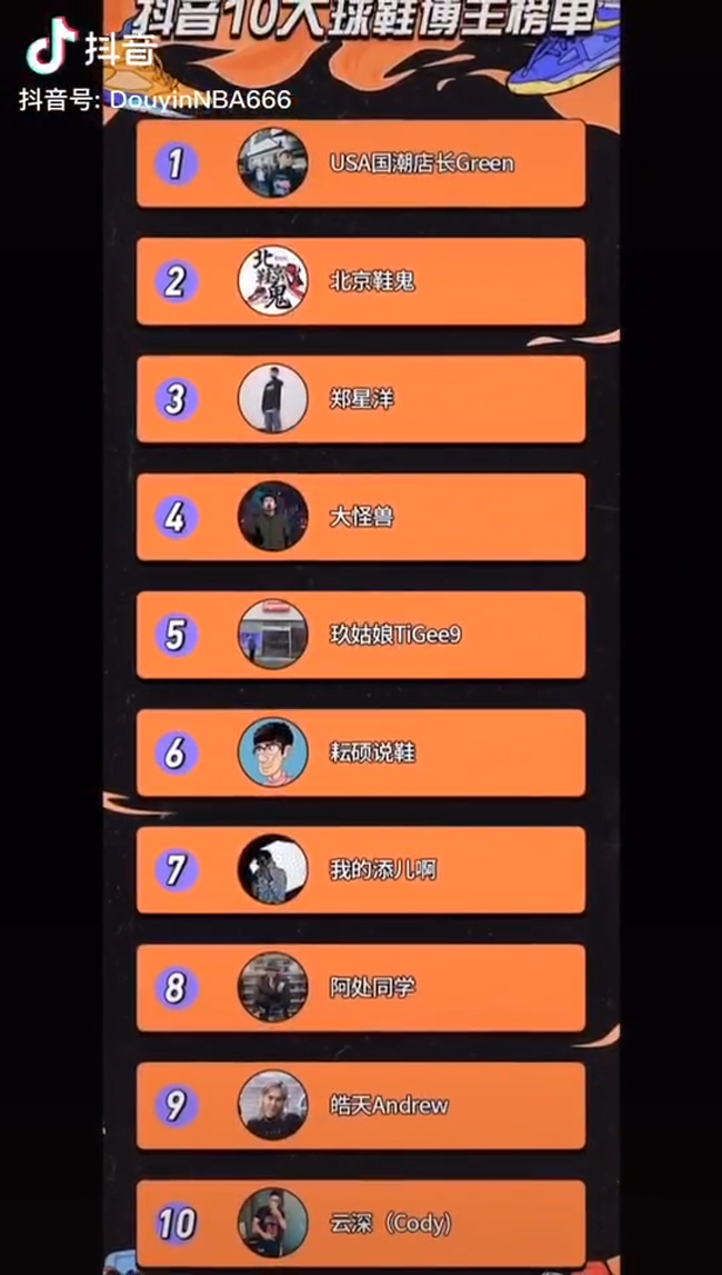 历经两周挑战活动,塔克亲自挑选出 「首届抖音 10 大球鞋博主」,USA 国潮店长 Green 荣登榜首,北京鞋鬼、郑星洋分列 2、3 位,大怪兽、耘硕说鞋等多位耳熟能详的球鞋博主纷纷上榜!
