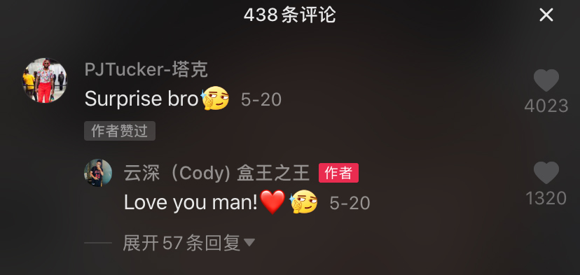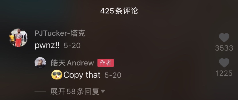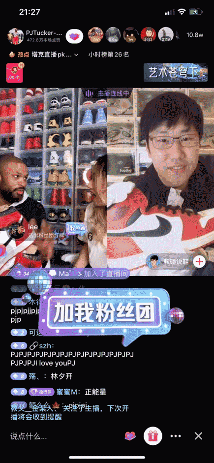 6 月 6 日 21:00 PJ 塔克降临抖音,开启他的首次直播,这也是 NBA 球星第一次在抖音平台直播,同时也是第一次进行球星与普通人之间连麦,耘硕、夏嘉欢、张卫平张指导分别参与了与塔克的这次连麦活动。