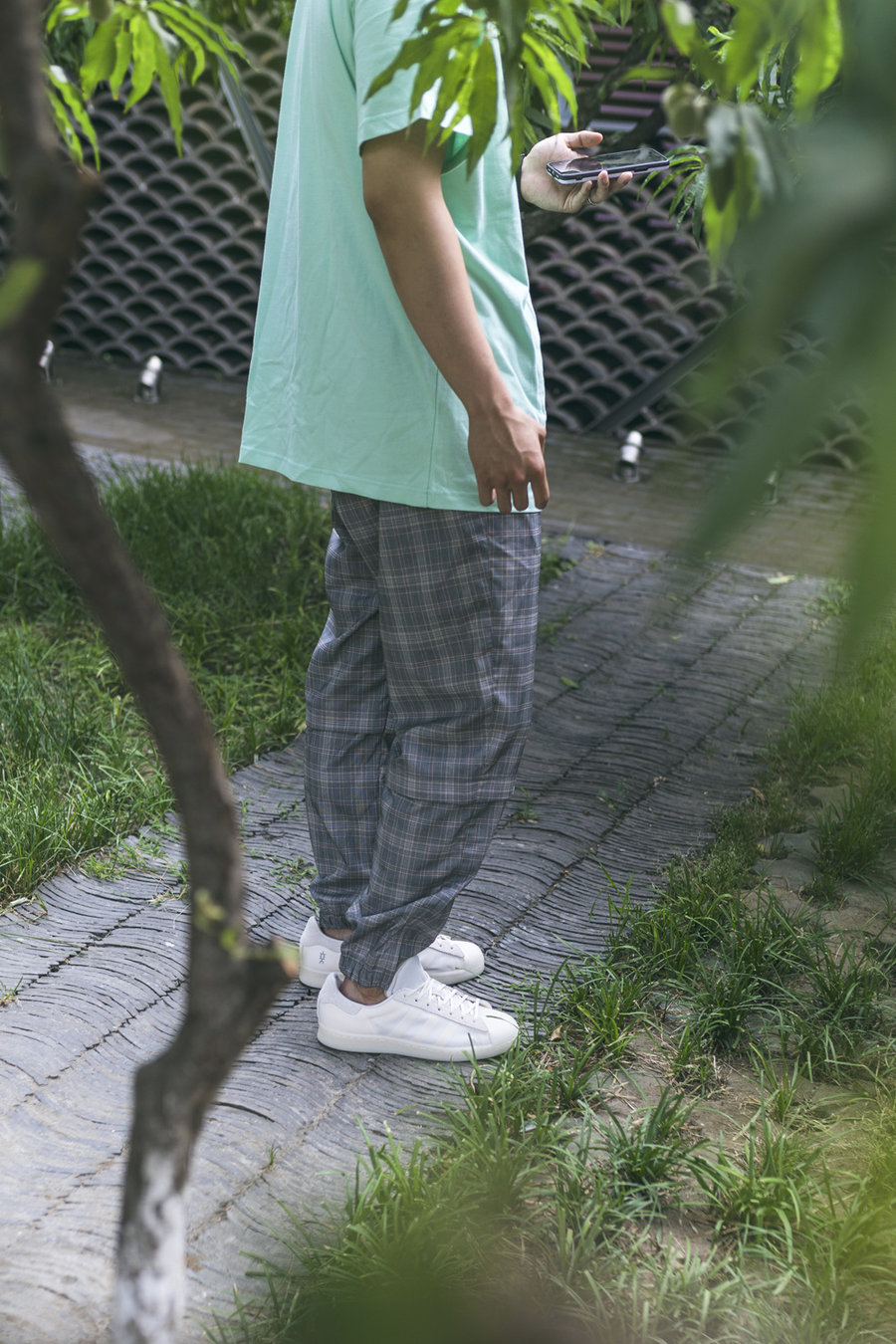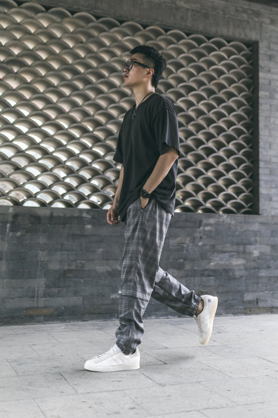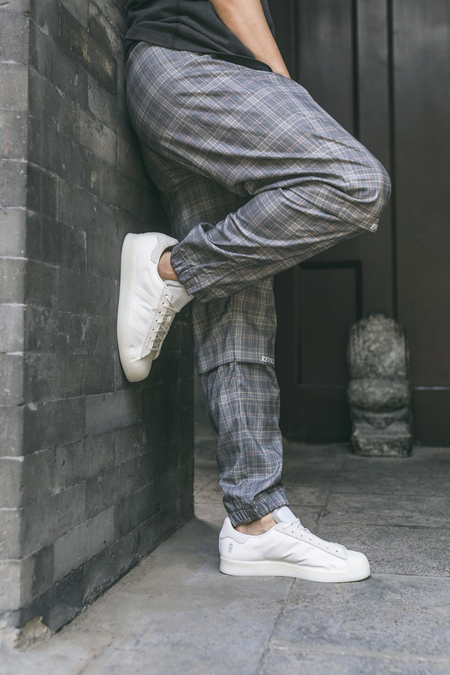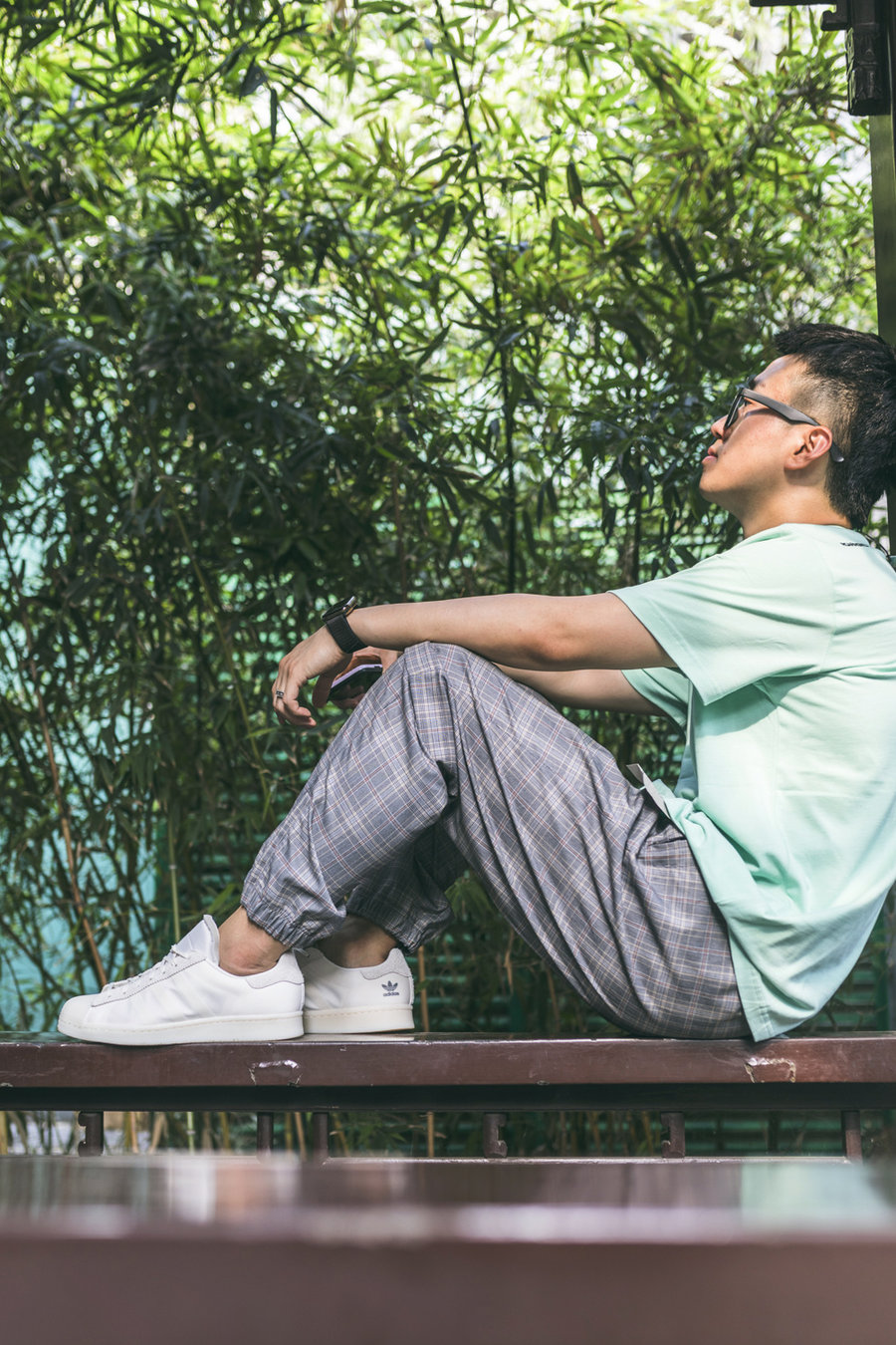 对于搭配 Superstar,Eason 也有自己的一套,彩色的袜子 + 宽松的 T 恤,想想就是 Eason 的风格。