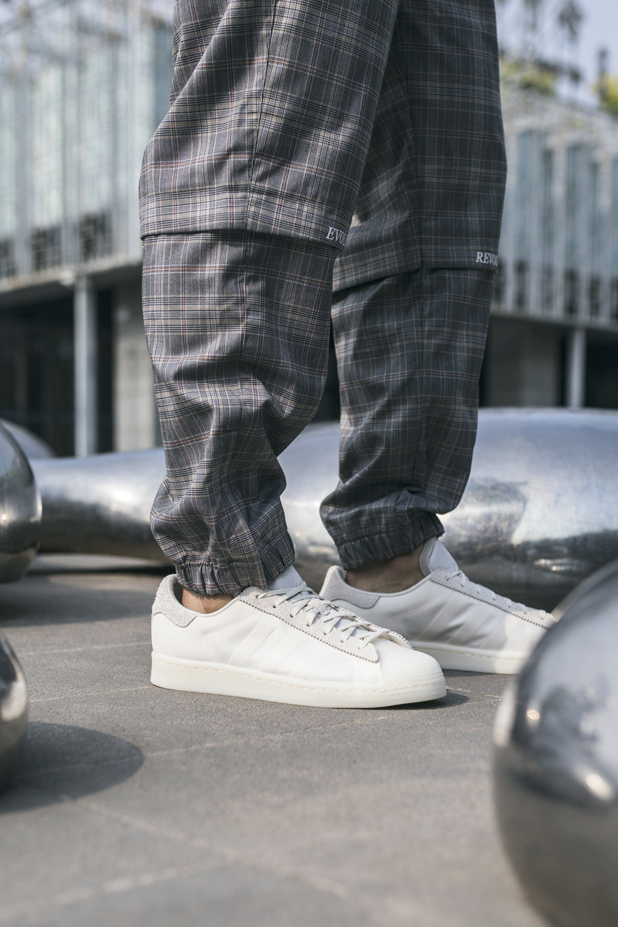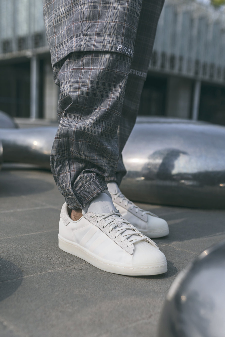 同时 adidas 也发布视频,Eason 展现出鞋头本色,讲述和 Superstar 的故事,并且教你这双联名该怎么穿!