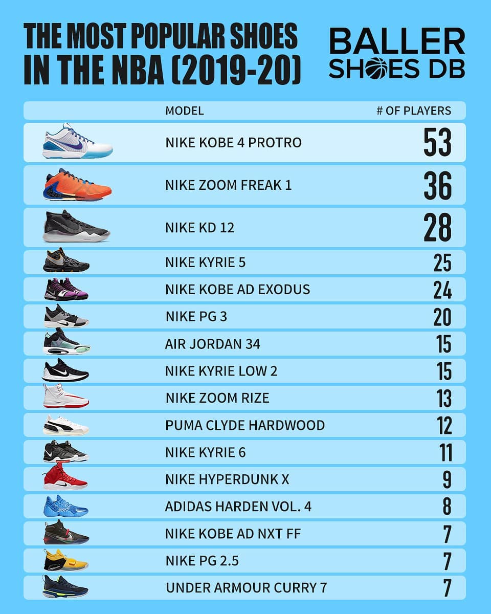 近日 Instagram 球鞋账号 @thesneakerbrief 统计出 2019 - 20 赛季 NBA 最流行的球鞋,在这份榜单中共有 16 双球鞋上榜,其中前三位分别是去年复刻的 Nike Kobe 4 Protro、字母哥初代签名战靴 Nike Zoom Freak 1 和杜兰特的 Nike KD 12。
