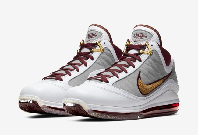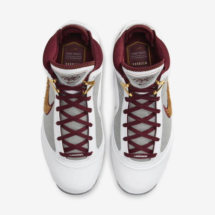 整双鞋采用白色皮革鞋面和灰色绒布面板,与葡萄酒和金色 Swoosh Logo 形成鲜明对比,呈现出那个时候詹皇所在的克利夫兰骑士队主调。