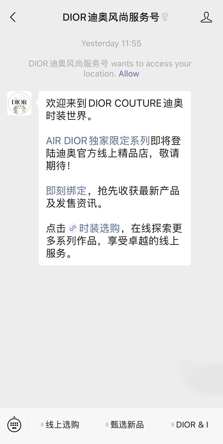同时 Dior 官网页面也已经更新了新的「DIOR 迪奥风尚服务号」二维码。