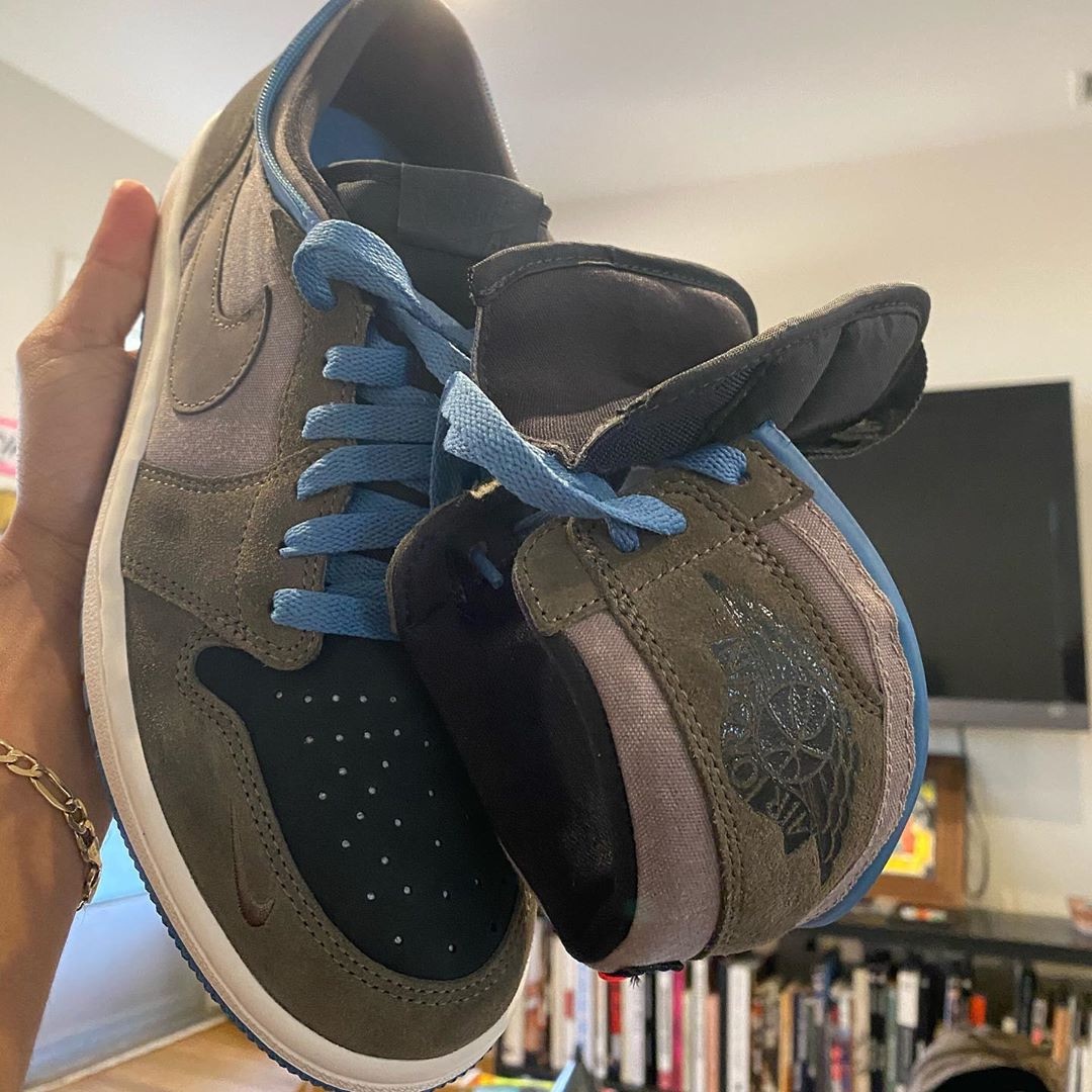 这双全新 Air Jordan 1 在配色上以棕色和黑色为主,鞋带和外底等细节中加入蓝色,整体色调看上去与低帮倒钩 Travis Scott x Air Jordan 1 Low 非常像。