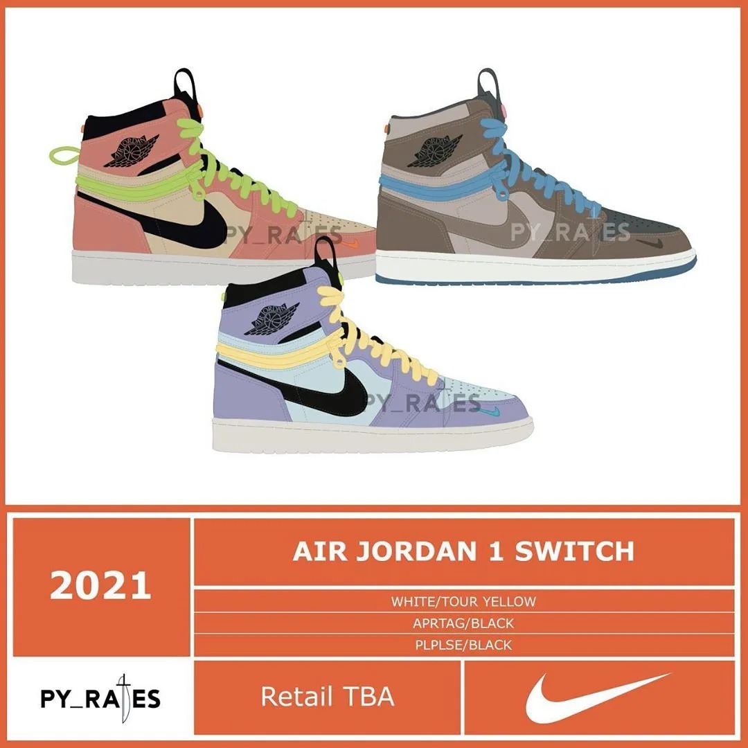 时隔数月后,Instagram 知名球鞋爆料账号 @py_rates_ 终于再次曝光了这双鞋的部分信息,似乎这双鞋的名称为 Air Jordan 1 Switch,同时还公布了三款配色,都计划将于明年发售。