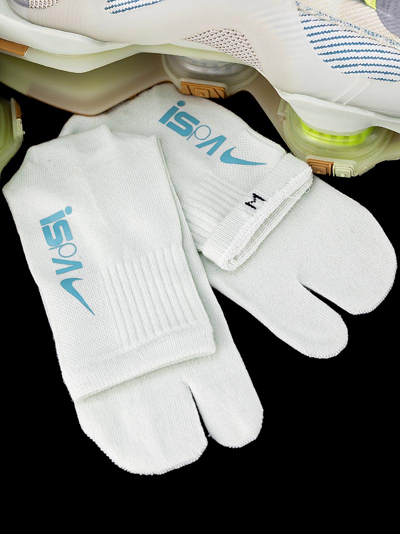 这次随鞋附赠带有 ISPA 标志的分趾袜,并依据球鞋的尺码不同,分大、中、小号予以适配。