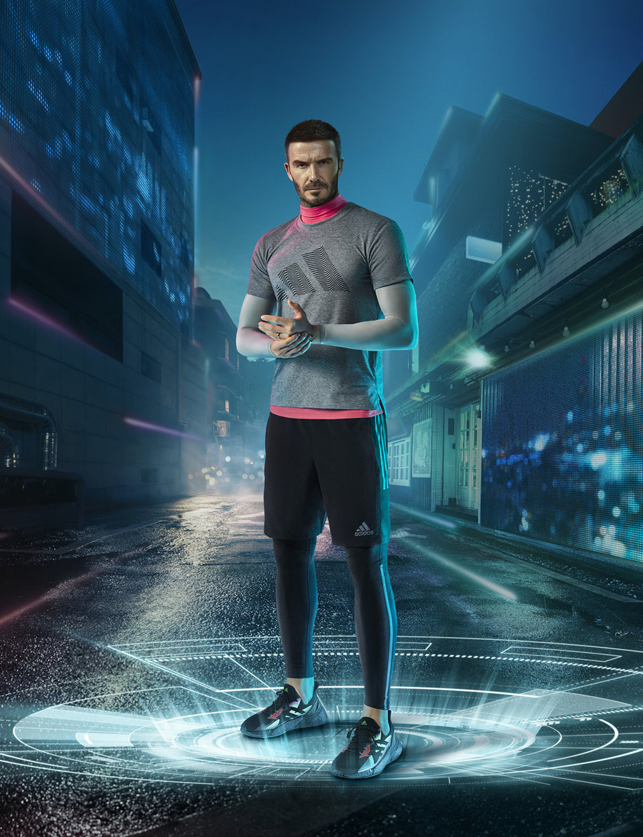 贝克汉姆率先上脚黑色款 adidas X9000 L4 跑鞋,以黑色为主调,辅以炫彩色调的材质。