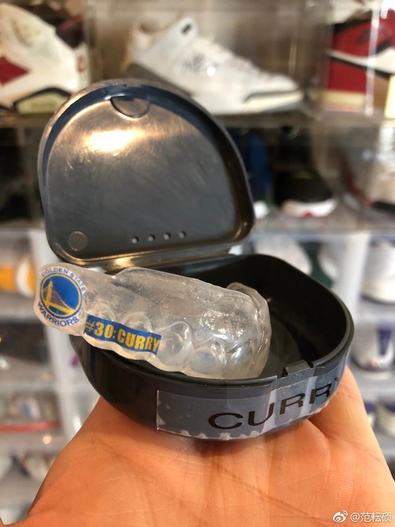 因为妻子是库里的忠实球迷,为此也有不少萌神的收藏,甚至连嘴里的牙套都能搞到!